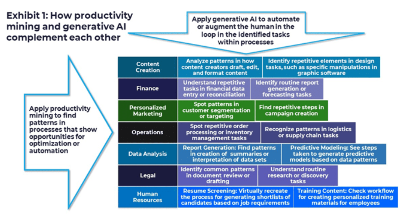- Content automation: Productivity mining highlights repetitive content-oriented tasks – e.g., writing standard emails or routine reports. It then identifies generative AI as the solution, that can adeptly auto-generate text to help human productivity.