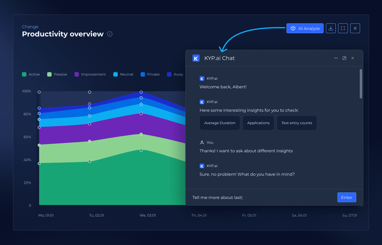 Beyond just tracking, KYP.ai suggests exactly where to cut wasted time and improve focus- empowering teams to work more effectively and achieve more.